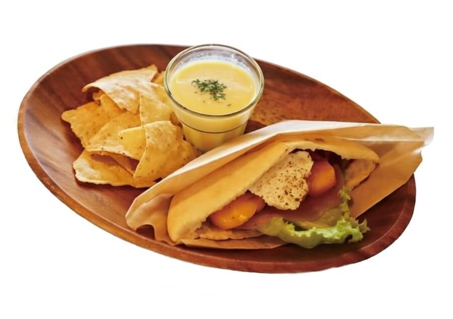 生ハム・チキン・ドライカレーの3種類から選べるピタサンド。季節の旬の果物を輪切りでアクセントに、具材をピタパンで包み、手が汚れにくく、気軽に楽しめます。散策の合間や、軽めのランチにもおすすめです。