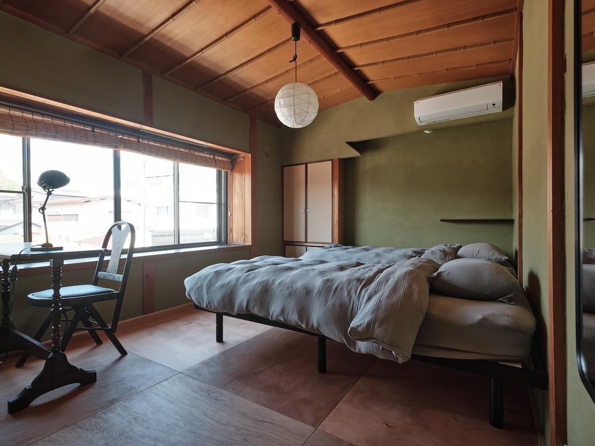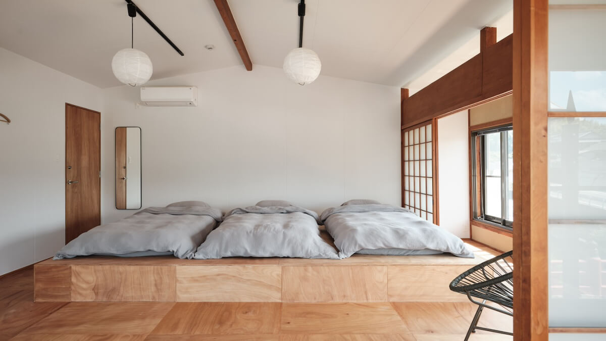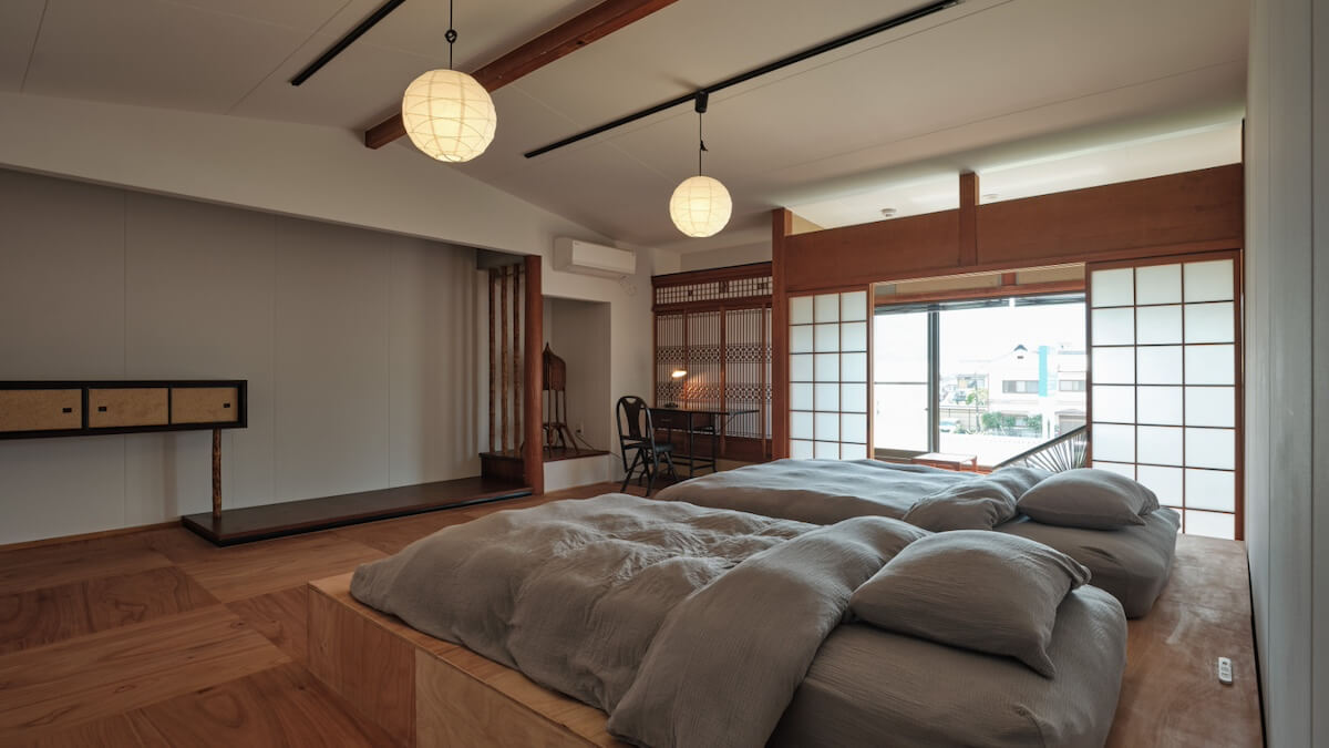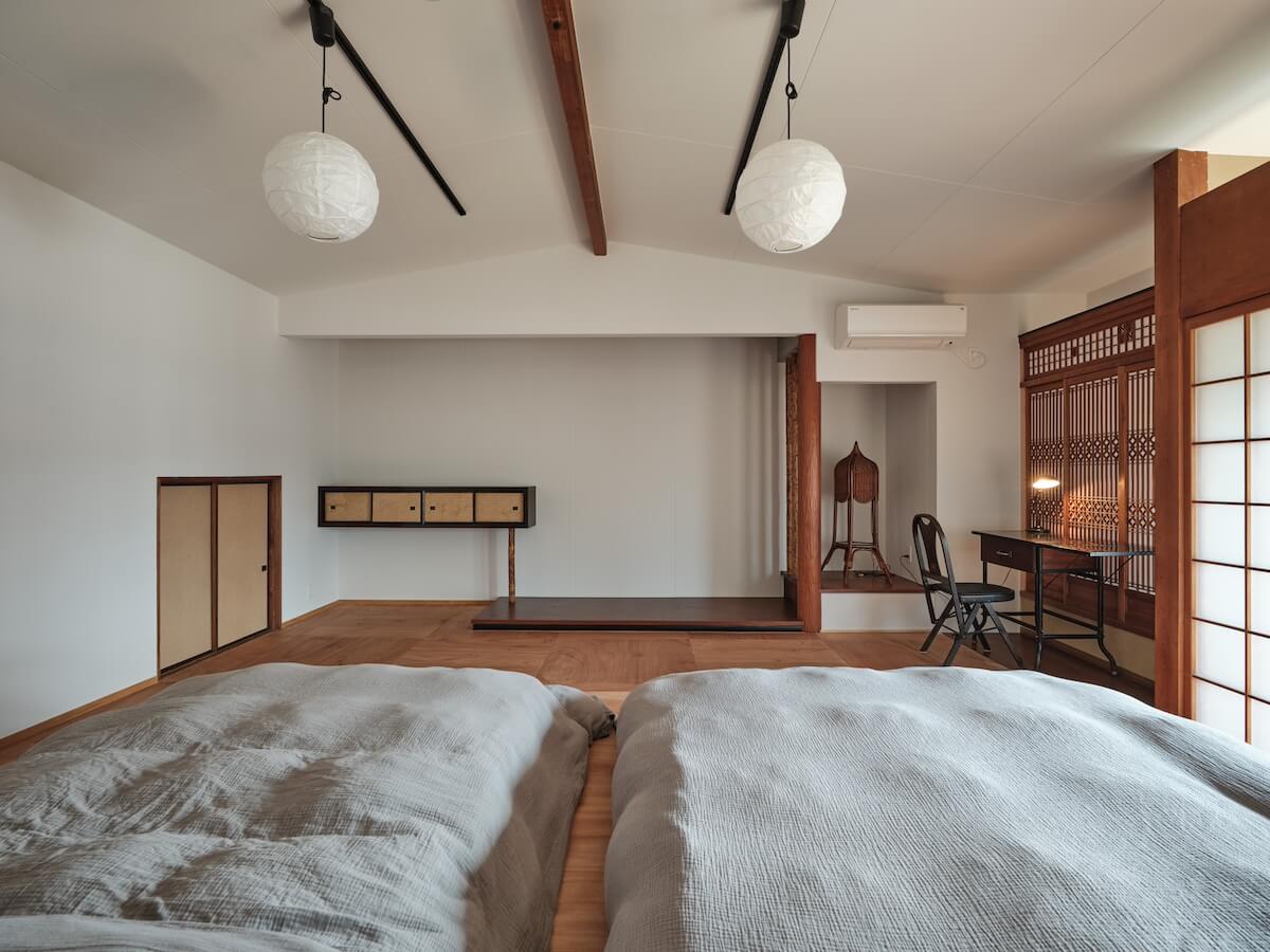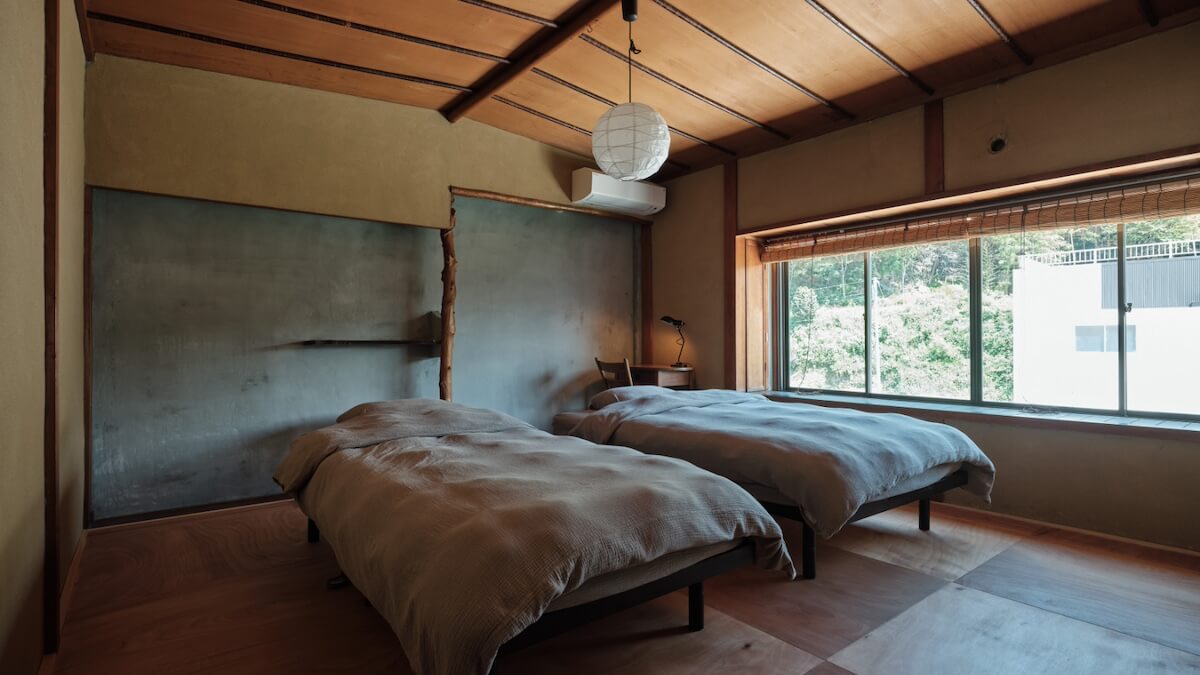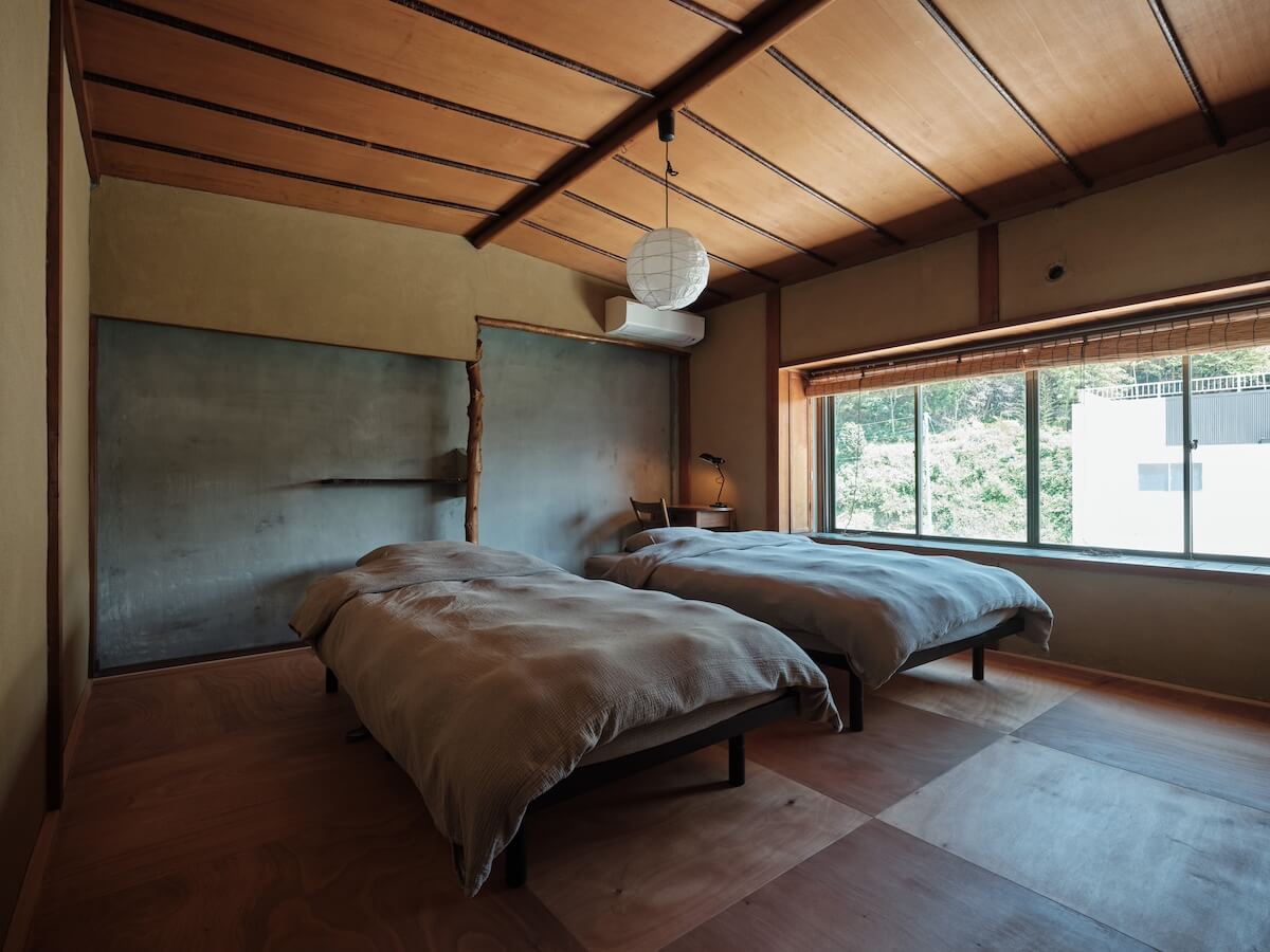 A Japanese-modern designed room featuring one single bed and one semi-double bed. It includes a work desk, and from the window, you can overlook the wooden deck. The stylish interior combines mortar and clay walls, blending the tranquility of traditional Japanese design with modern aesthetics.