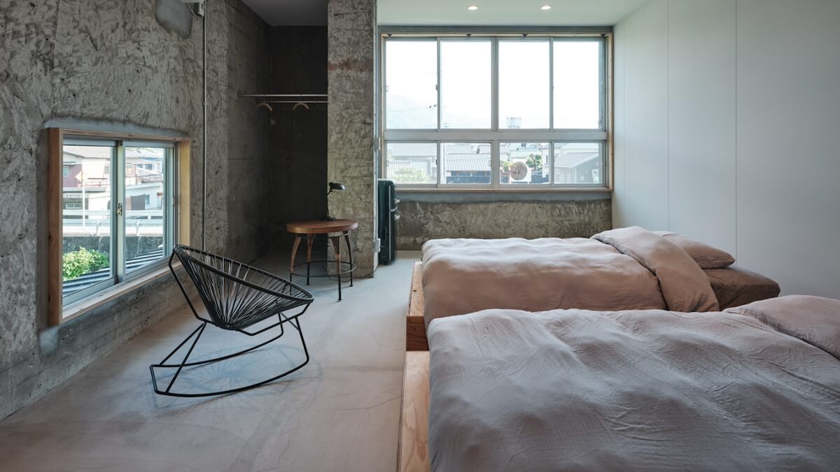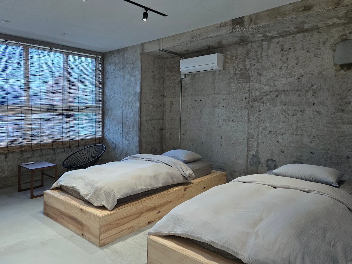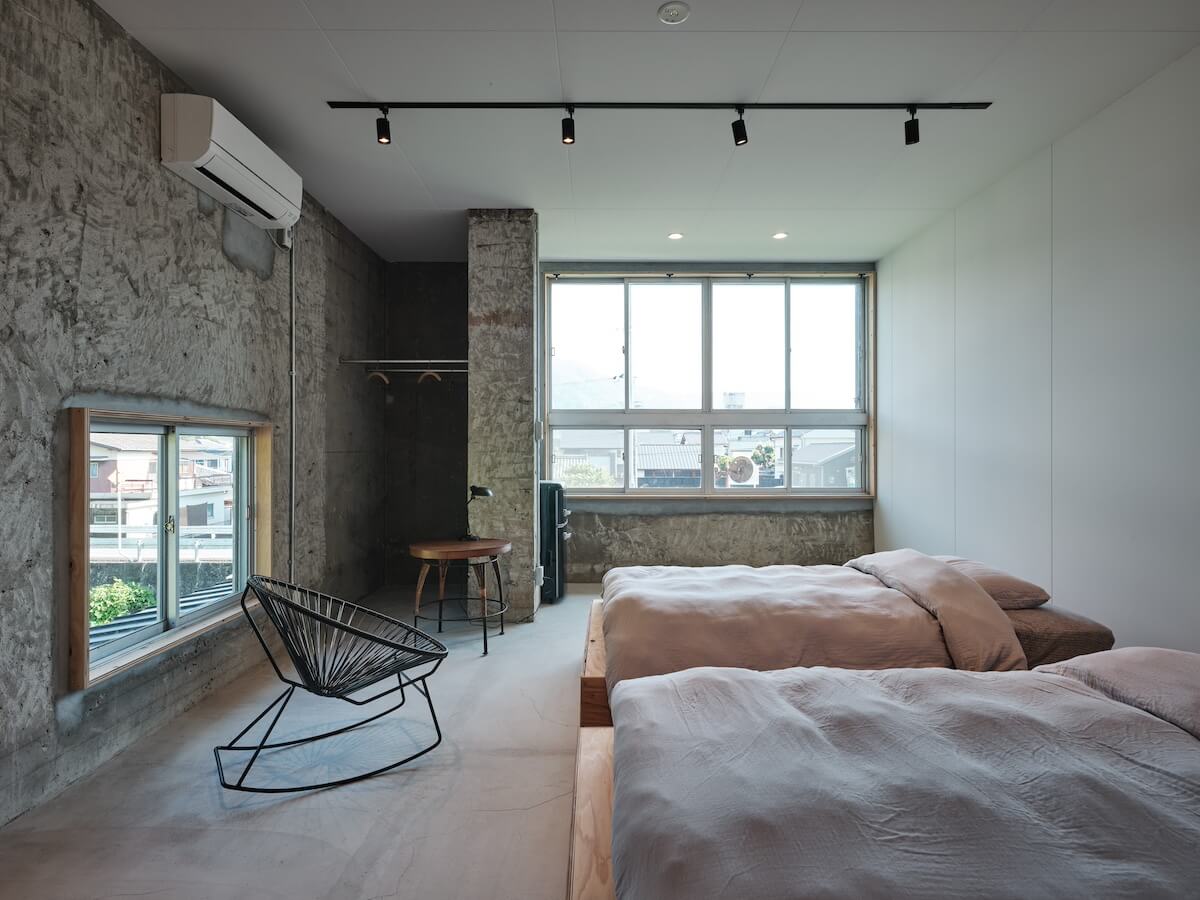 A functional room featuring two single beds, a work desk, and a refrigerator. The large window allows bright south-facing light to pour in, while the chic design of concrete and white walls gives the room a sophisticated, modern feel. This room is suitable for a wide range of uses, from business to tourism.