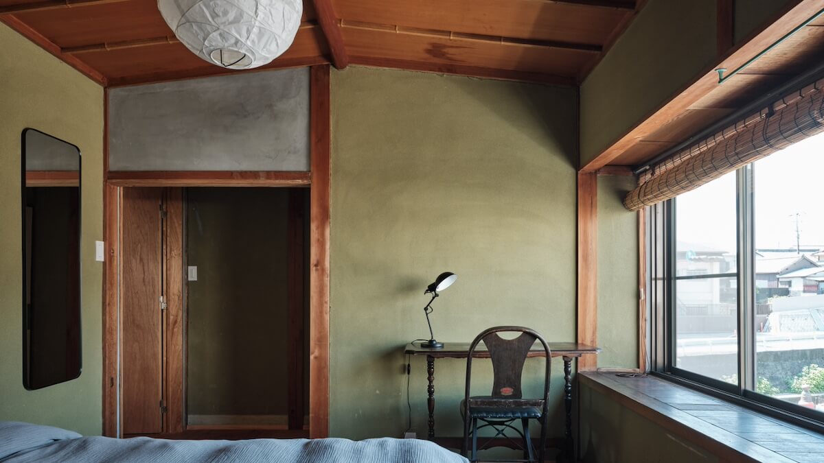 This room is equipped with one single bed, one semi-double bed, and a work desk. Opening the frosted glass door reveals views of the river. The room includes a traditional alcove (tokonoma), offering a glimpse of the pre-renovation Japanese house ambiance. Ideal for those who wish to enjoy the quiet riverside and appreciate the beauty of traditional Japanese aesthetics.